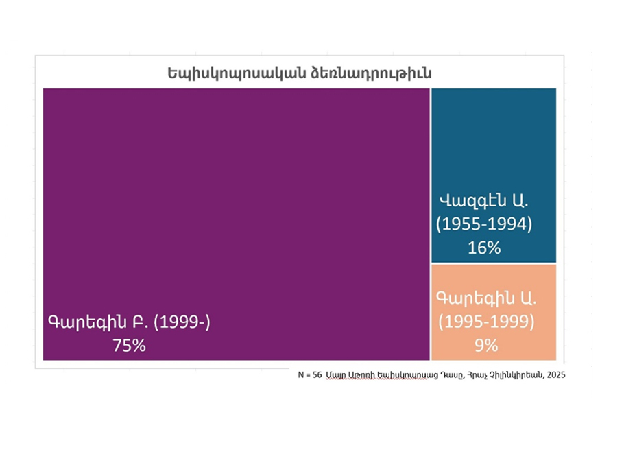Առանձնապես ուշագրավ է թեմակալ առաջնորդների նշանակման ձեւը, որը բացահայտում է կառավարման որոշակի ձեւաչափ։ Վիճակագրությունը ցույց է տալիս, որ առաջնորդների 64%-ը նշանակված է անմիջականորեն Կաթողիկոսի կողմից, մինչդեռ միայն 36%-ն ընտրված է թեմական մակարդակով։ Պարզված ընդհանուր պատկերը ցույց է տալիս, որ եկեղեցու կառուցվածքը բնորոշվում է խիստ կենտրոնացմամբ։