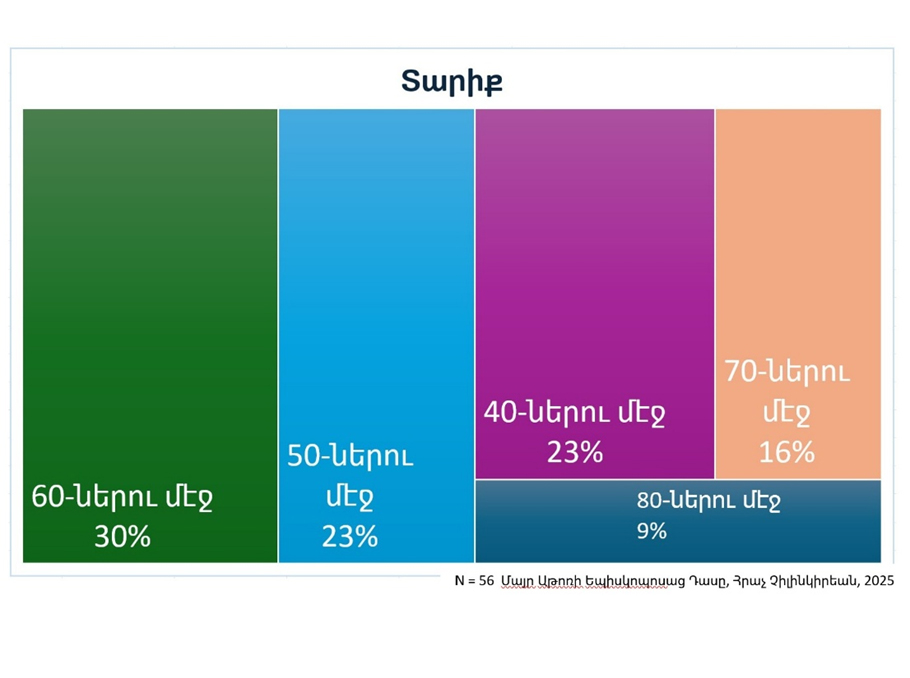 Մյուս կողմից՝ 70-ից բարձր տարիք ունեցողները կազմում են զգալի բաժին՝ ընդհանուրի 25%-ը, որտեղ 16%-ը պատկանում է 70-ականներին, իսկ 9%-ը՝ 80-ականներին, ինչը ցույց է տալիս ավագ սերնդի կարեւոր ներկայությունը եւ նրանց կուտակված փորձառության կարեւոր դերը։