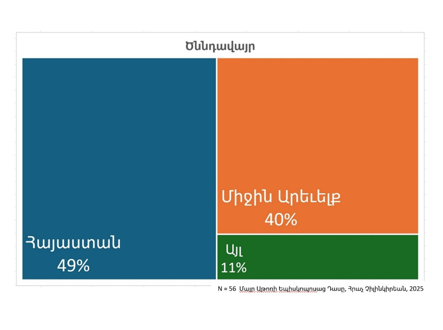 Աշխարհագրական ծագման վիճակագրության պատկերը ցույց է տալիս, որ Եպիսկոպոսների գրեթե կեսը՝ 49%-ը, ծնվել է Հայաստանում, որտեղ Մայր Հայրենիքը կենտրոնական դեր է խաղում որպես հոգեւորականության հիմնական աղբյուր։ Միեւնույն ժամանակ Մերձավոր Արեւելքի երկրներում ծնված եպիսկոպոսները կազմում են շատ մեծ բաժին՝ 40%, հաստատելով հատկապես Մերձավոր Արեւելքի ավանդական հայկական համայնքների երբեմնի կենսական դերը հոգեւորականների պատրաստության կարեւոր գործում։