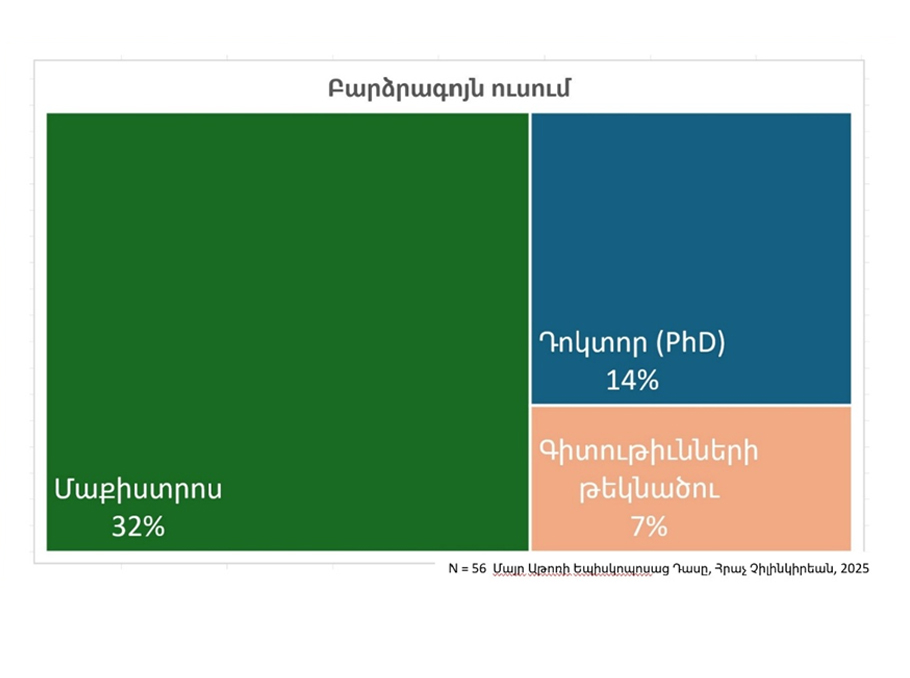 Ըստ տվյալների՝ 57 եպիսկոպոսներից 30-ը ճեմարանական ուսումից բացի բարձրագույն ուսման տիտղոսներ ունի (Մագիստրոս կամ Դոկտորական)։ Մեծագույն խումբը կազմում են մագիստրոսի աստիճան ունեցող եպիսկոպոսները, որոնք ներկայացնում են ընդհանուրի 32%-ը։ Դոկտորական աստիճան ունեցողները կազմում են 14%։ Նրանց հաջորդում են գիտությունների թեկնածուի աստիճան ունեցողները՝ 7%, որոնք լրացնում են ընդհանուր գիտական պատկերը։ Այս բաշխումը պարզում է, որ Եպիսկոպոսների դասի 53%-ն ունի բարձրագույն գիտական աստիճաններ (մագիստրոս, դոկտոր կամ թեկնածու), ինչը շեշտում է կազմի լուրջ գիտական ներուժը։ Բարձրագույն տիտղոս ունեցողների ճնշող մեծամասնությունն իր ուսումը ստացել է եվրոպական եւ ամերիկյան համալսարաններում։