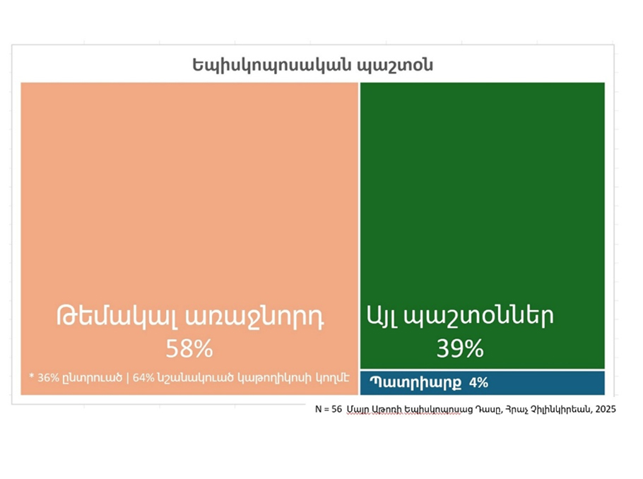 Եկեղեցու նվիրապետական կառուցվածքում եպիսկոպոսների պաշտոնների բաշխումը ցույց է տալիս, որ եպիսկոպոսների մեծամասնությունը՝ 58%-ը, վարում է թեմակալ առաջնորդի պաշտոն։ Իսկ դասի 39%-ն ընդգրկված է վարչական կամ եկեղեցական այլ պատասխանատվություններում։ Եպիսկոպոսների դասի մեջ կան երկու (4%) պատրիարք՝ Երուսաղեմի եւ Պոլսի։