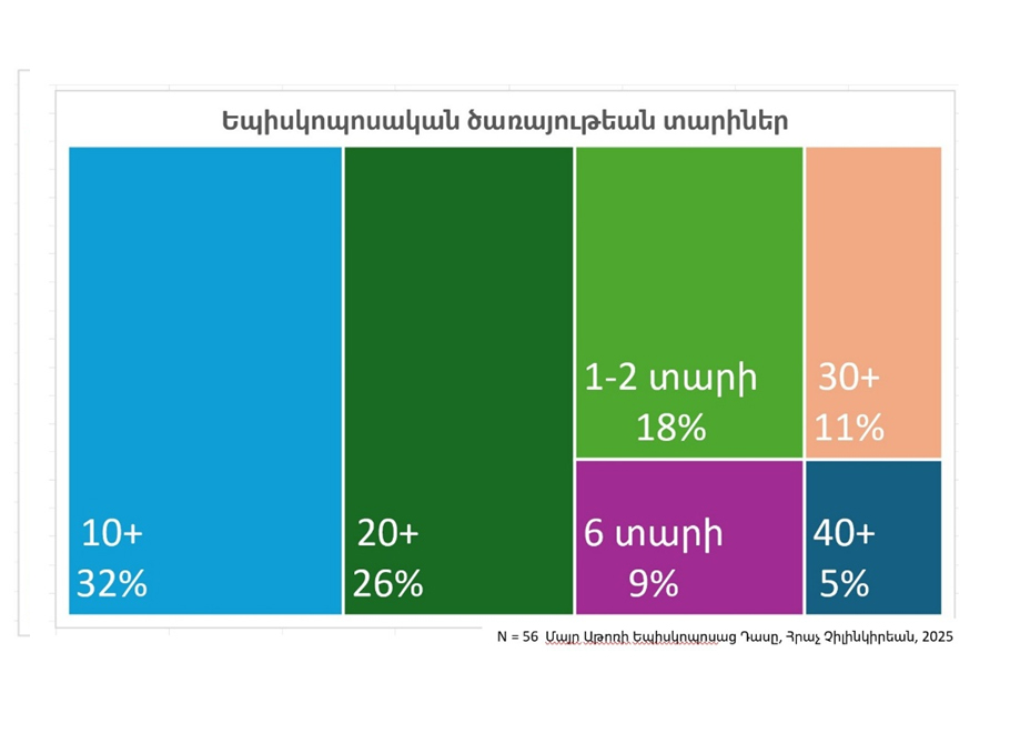 Այս տվյալները ներկայացնում են եպիսկոպոսների փորձառության մակարդակը՝ հիմնված նրանց ձեռնադրությունից ի վեր անցած տարիների վրա, եւ բացահայտում են կայուն, երկարամյա ծառայություն ունեցող նվիրապետական կազմի պատկերը։ Ամենամեծ խումբը կազմում են այն եպիսկոպոսները, որոնք 10+ տարվա ծառայություն ունեն, որոնք ներկայացնում են ընդհանուրի 32%-ը, այսինքն՝ գրեթե մեկ երրորդն արդեն ունի ավելի քան տասնամյա փորձառություն այս բարձրագույն աստիճանում։ Նրանց հաջորդում են 20+ տարվա ծառայություն ունեցողները՝ 26%, որոնք ներկայացնում են ավելի տարեց եւ փորձառու սերնդին՝ երկու տասնամյակից ավելի ծառայության պատմությամբ։ Նոր ձեռնադրված եպիսկոպոսները, որոնք ընդամենը 1-2 տարվա փորձառություն ունեն, կազմում են 18%։ Այս պատկերը լրացնում են ամենափորձառու ավագ ծառայողները, որոնցից 16%-ն ունի երկարամյա ծառայության վաստակ, որտեղ 11%-ն ունի 30+ տարվա, իսկ 5%-ը՝ 40+ տարվա եպիսկոպոսական ծառայություն։
