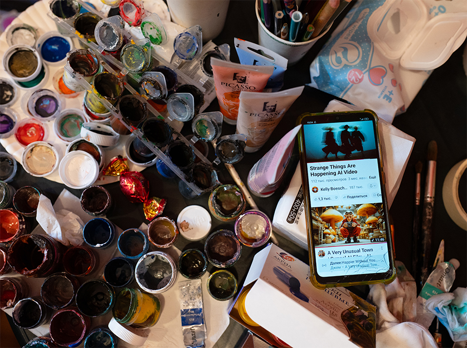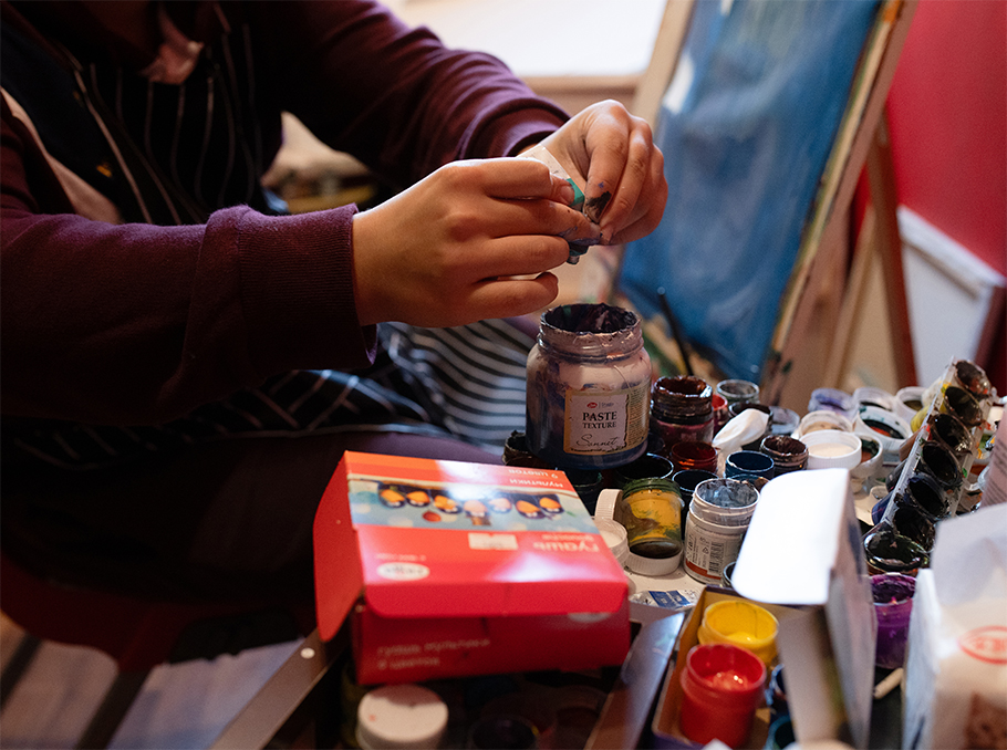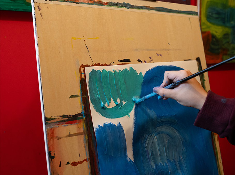 Թողնում էի, որ անի այն, ինչ իրեն դրական էմոցիա է պարգեւում, վայելի գույներն ու զգացողությունները։ Նկատել եմ, որ առանձնահատուկ շատ սիրում է փիրուզագույնը, նարնջագույնը, բայց երբեք չի կենտրոնանում մեկ գույնի վրա։ Միշտ խառնում է ներկերը, ստանում իր գույնը եւ փոխանցում կտավին։