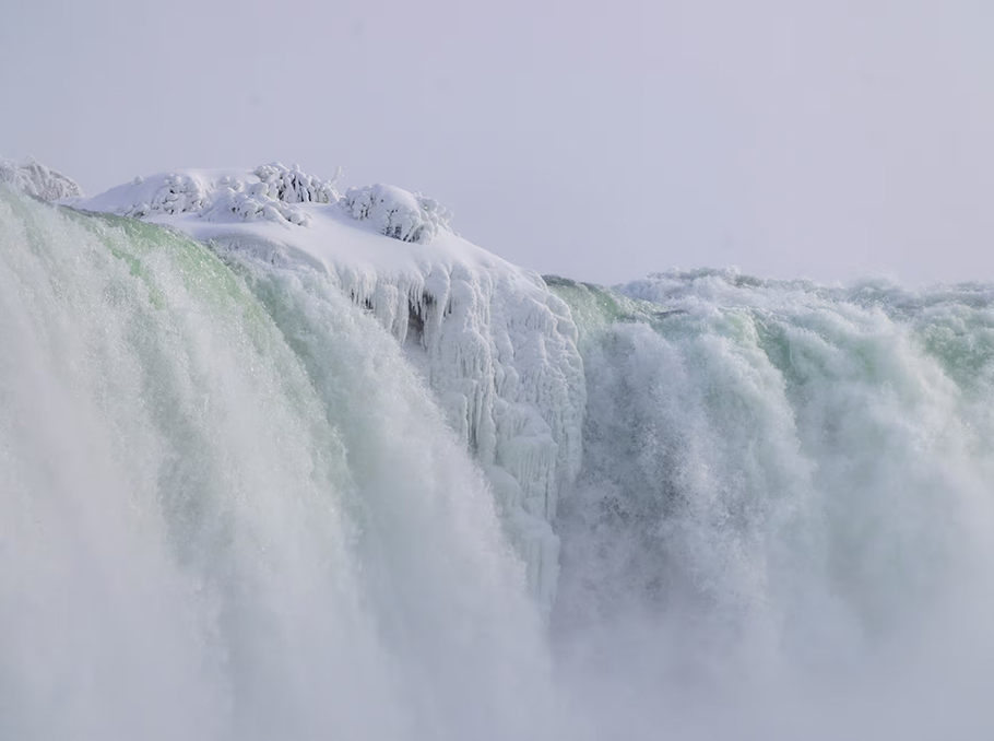 While the falls appear completely frozen, the volume and constant movement of the water make a full freeze nearly impossible. Water continues to flow beneath a shell of ice and frozen mist on the surface. In winter, about 85 million litres of water per minute tumble over the falls, hitting speeds of up to 40 kilometres per hour.