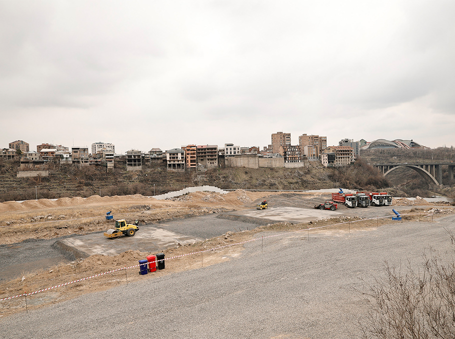 Large glazed openings at each end frame long views. To the north lies the river gorge while, to the south, Mount Ararat rises beyond the city. The building’s orientation establishes a direct visual relationship with these landmarks and embeds the project within the geography of Armenia.