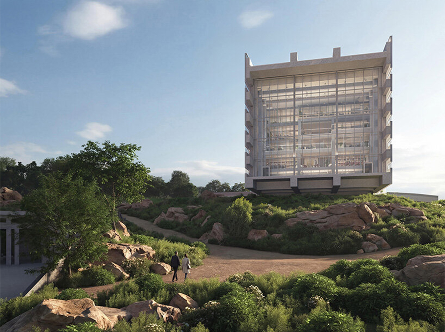 MVRDV’s 120-meter-long building sits atop a sunken base and cantilevers at both ends over steep terrain. The architects shape the elongated form to read as a single volume, elevated to increase visibility from across the gorge. The podium lifts the structure while extending the topography of Tumanyan Park toward the facade.
