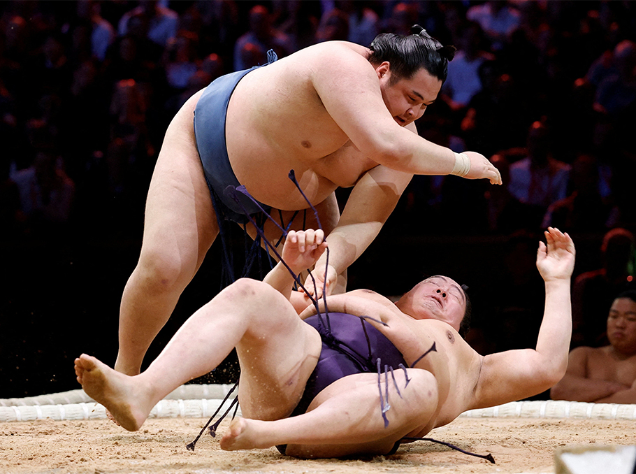 Onokatsu in action against Ichiyamamoto during the twelfth bout of the Grand Sumo Tournament at Royal Albert Hall in London.