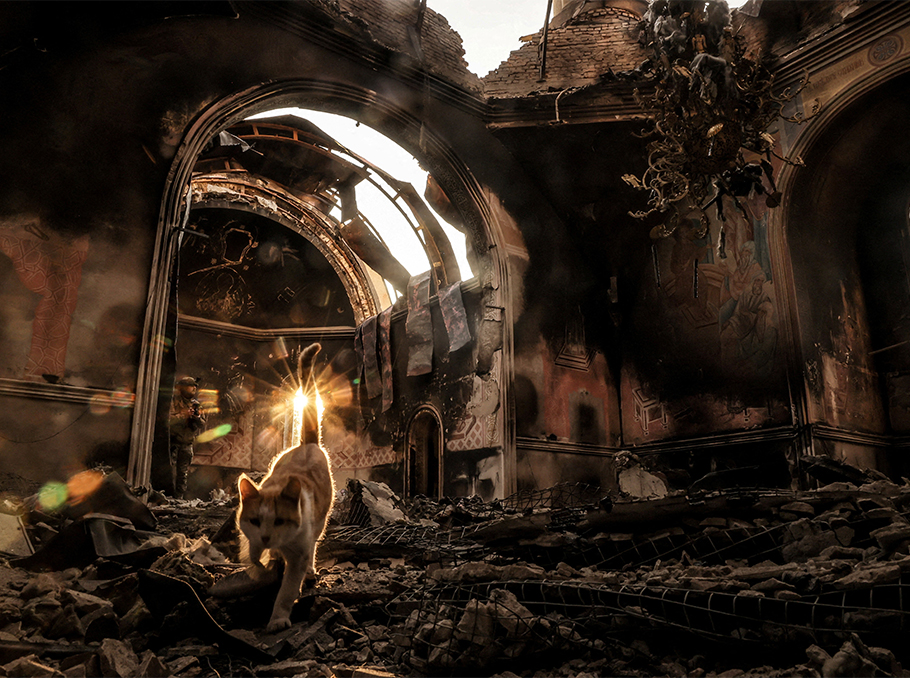 A cat walks on debris in a church damaged by a Russian military strike in the frontline town of Kostiantynivka in Donetsk region.