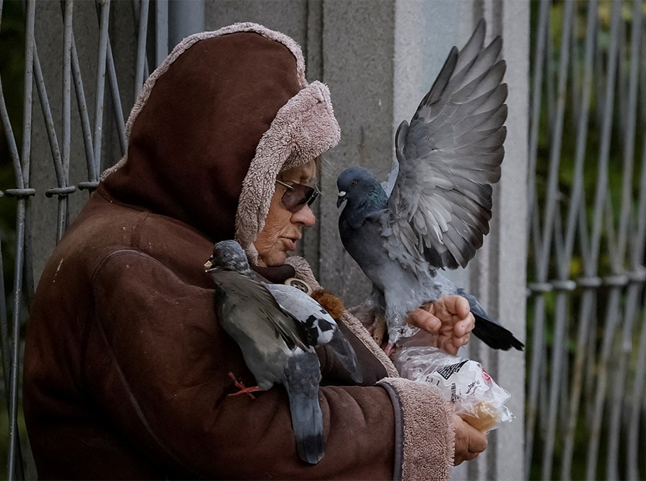 A woman feeds pigeons on the street in Kyiv, Ukraine.