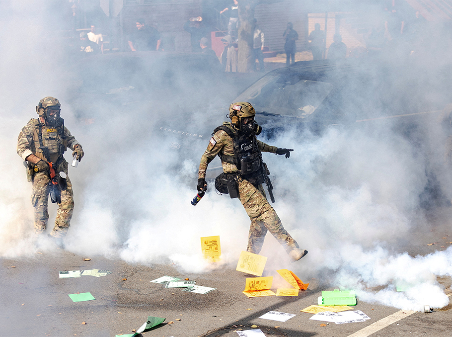 A federal agent kicks a tear gas canister during clashes with community members on Chicago's South Side.