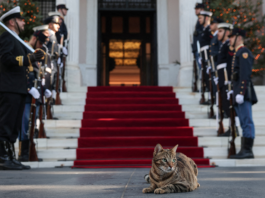 A cat called Clio sits by the red carpet, just before the meeting between Greek Prime Minister Kyriakos Mitsotakis welcomes Moldovan President Maia Sandu in Athens.