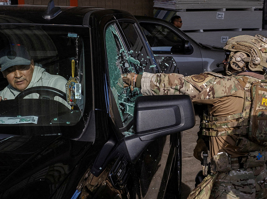 U.S. federal agents smash a car window while trying to detain a man during an immigration raid in Chicago.