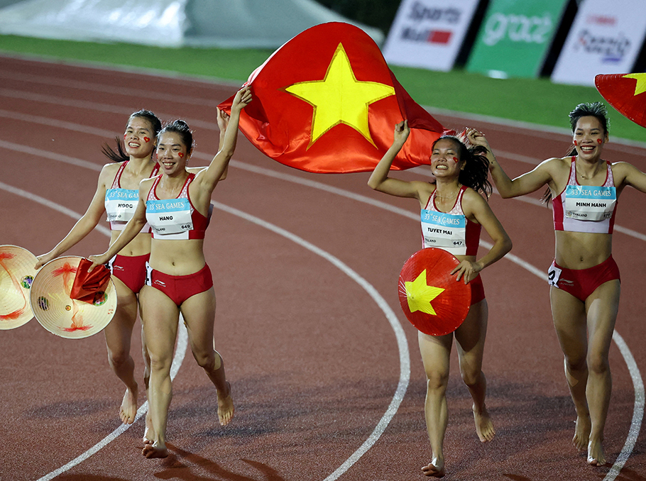 Vietnam's team celebrate after winning the women's 4x400m relay final at the Southeast Asian Games.