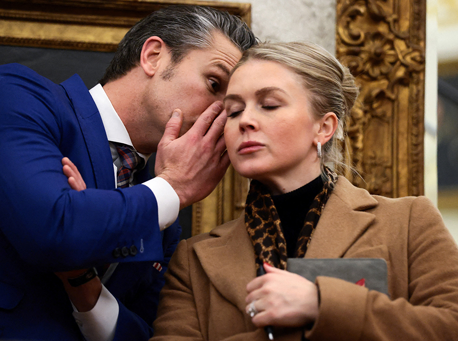 U.S. Secretary of Defense Pete Hegseth speaks to White House Press Secretary Karoline Leavitt.