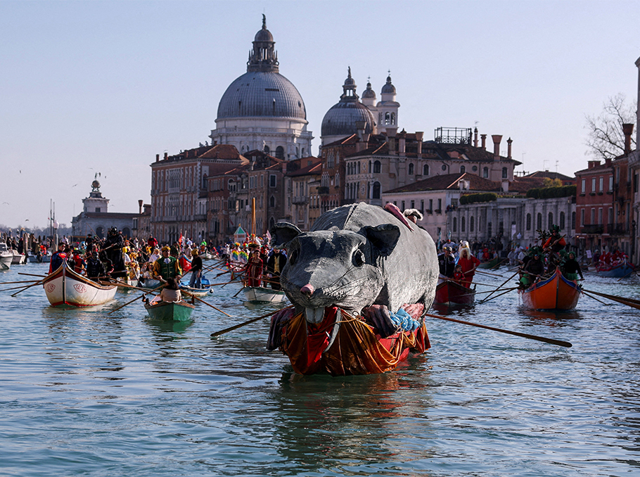 A boat carries a "Pantegana", the big rat, as revellers row during the masquerade parade on the Grand Canal during the Venice Carnival.