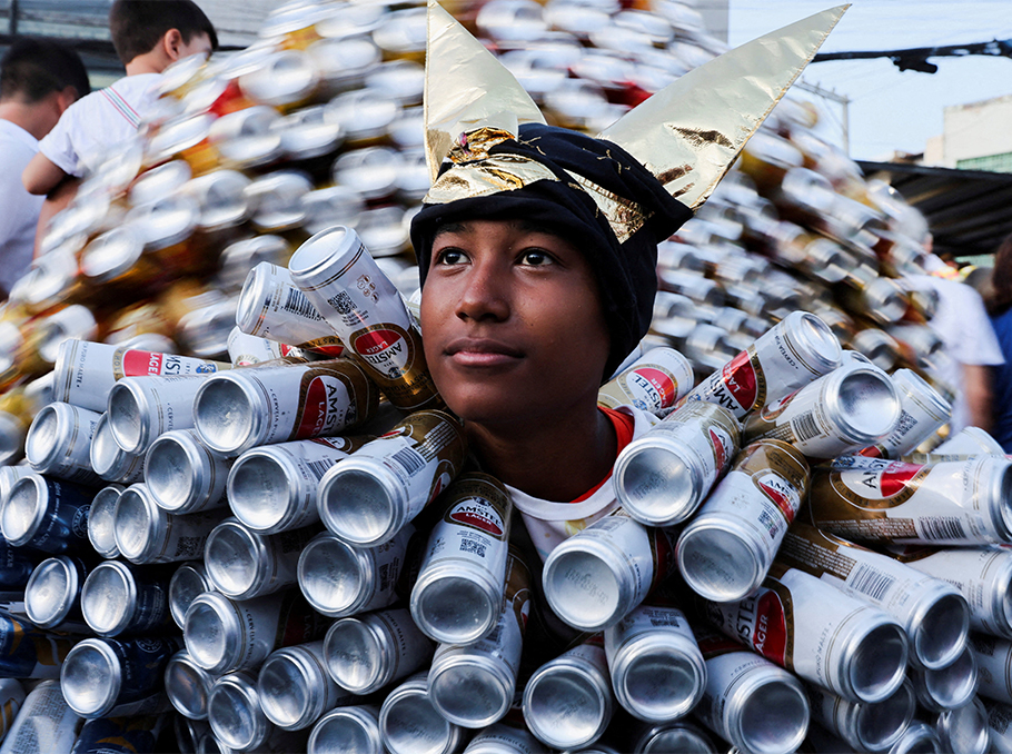 A reveller from cultural society Bloco das Latinhas looks on during Carnival festivities in Salvador, Brazil.
