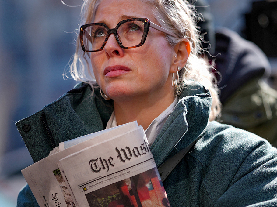 A person holds a newspaper as union members and supporters gather at a 'Save the Post' rally outside The Washington Post after widespread layoffs were announced.