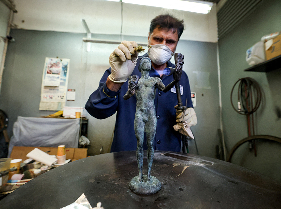 Ricardo Godinez applies the patina on a "The Actor" statuette during a media event on the production of the statuettes for the 32nd annual Screen Actors Guild Awards at American Fine Arts Foundry in Burbank.