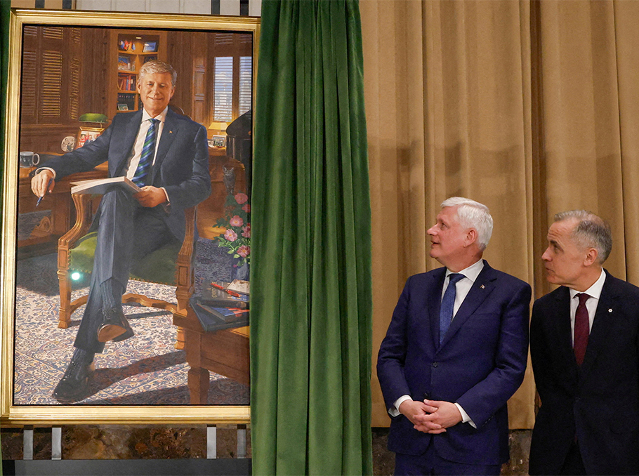 Former Canadian Prime Minister Stephen Harper and Canada's Prime Minister Mark Carney view Harper's official portrait at a ceremony in Ottawa.