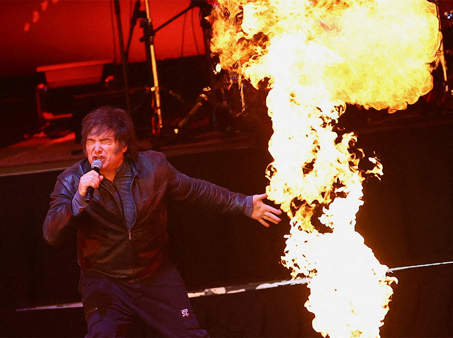 Президент Аргентины Хавьер выступает со своей группой на презентации своей книги в Буэнос-Айресе.