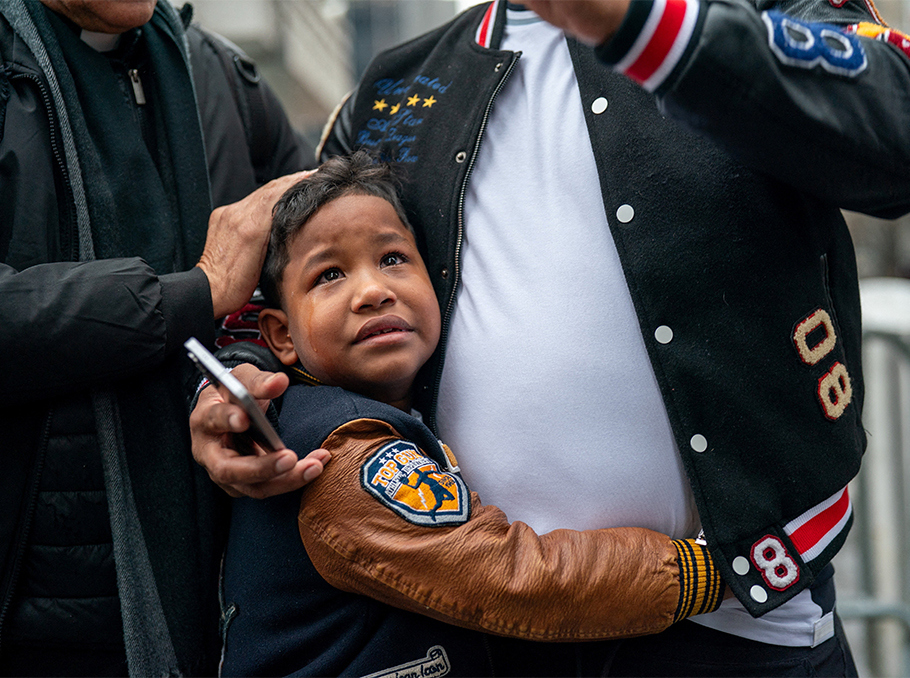 Ребёнок держится за отца у здания иммиграционного суда на Манхэттене.