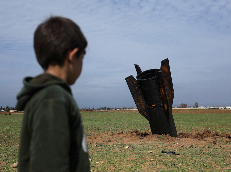 Ребёнок стоит рядом с ракетой, упавшей недалеко от аэропорта Камышлы в Сирии.