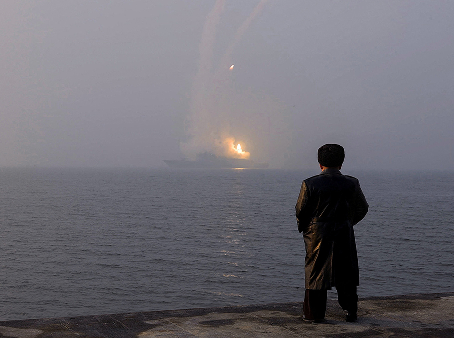Северокорейский лидер Ким Чен Ын наблюдает за испытательным пуском ракеты с корабля «Чхве Хён».