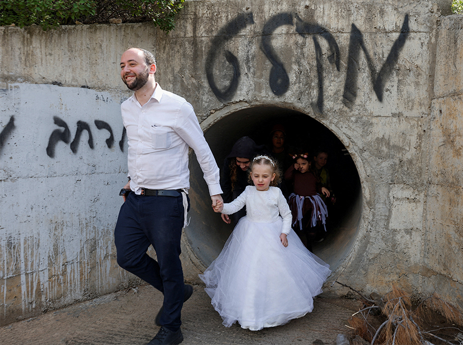Израильтяне выходят из укрытия после отмены воздушной тревоги. Девочка одета в праздничное платье по случаю праздника Пурим.