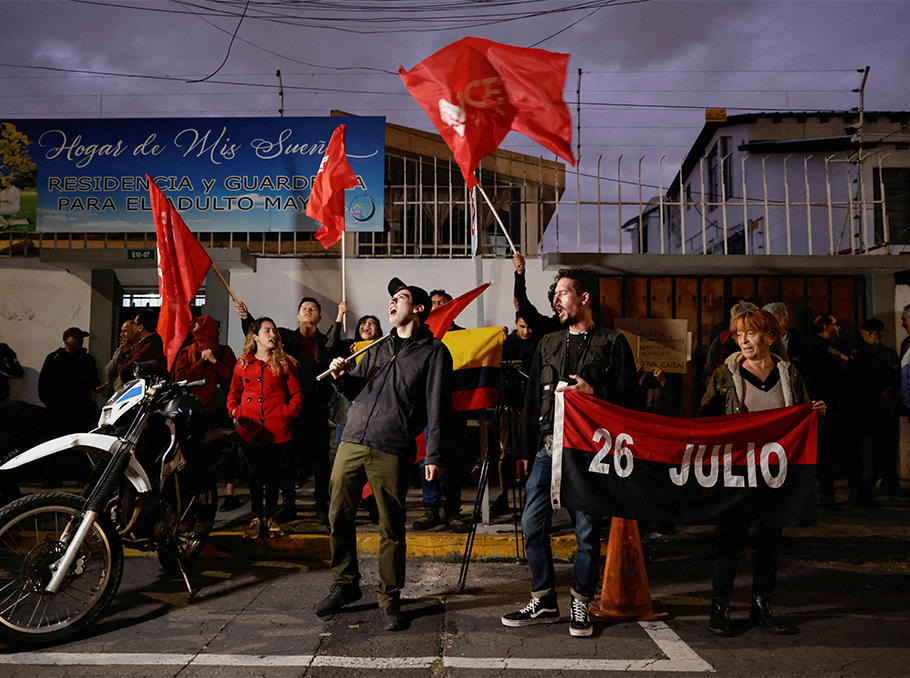 Люди машут флагами Коммунистической партии Эквадора у посольства Кубы после того, как Эквадор объявил кубинского посла «персоной нон грата».